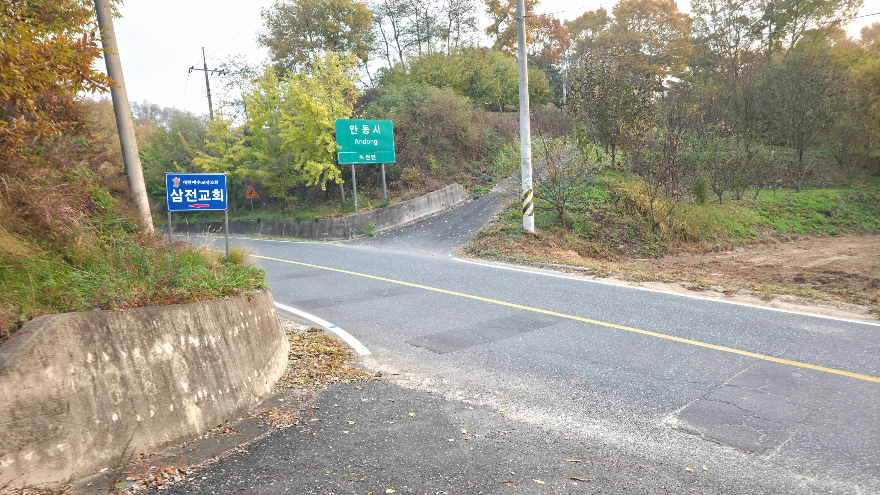 안동시 녹전면 경계표시판과 삼전교회 안내판이 보입니다.