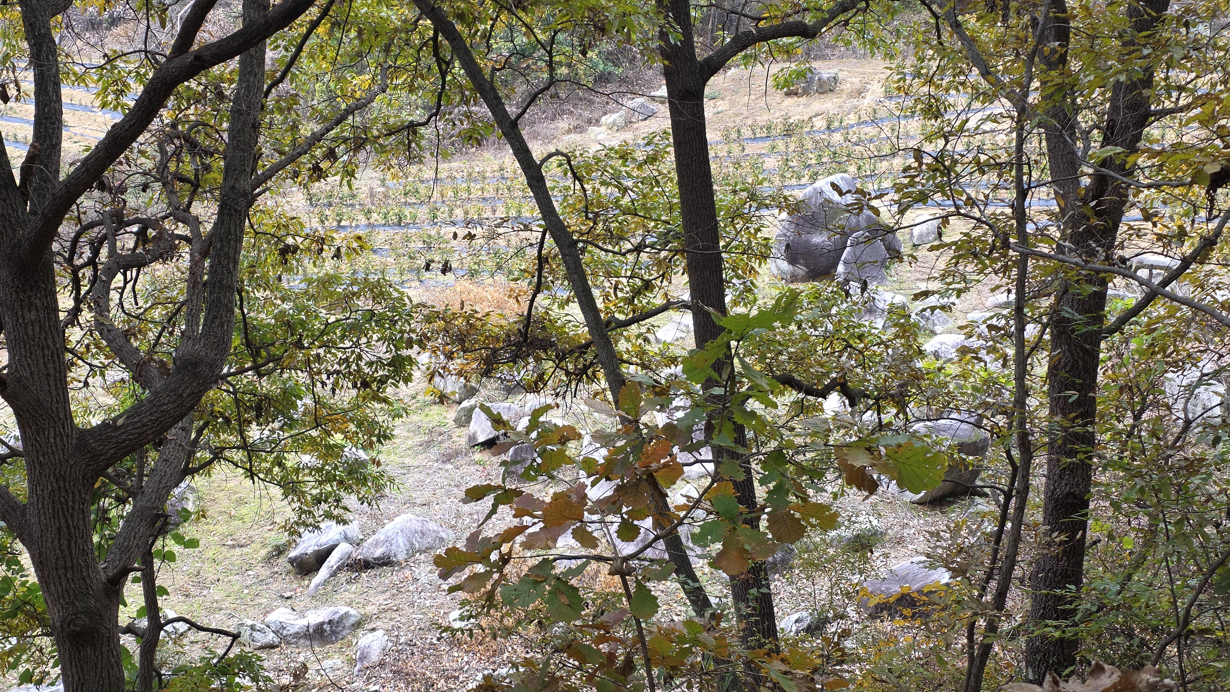 능선길 우편에는 밭이 보이는데 밭에는 자연석들이 줄비하여 색다른 풍경으로 다가섭니다.