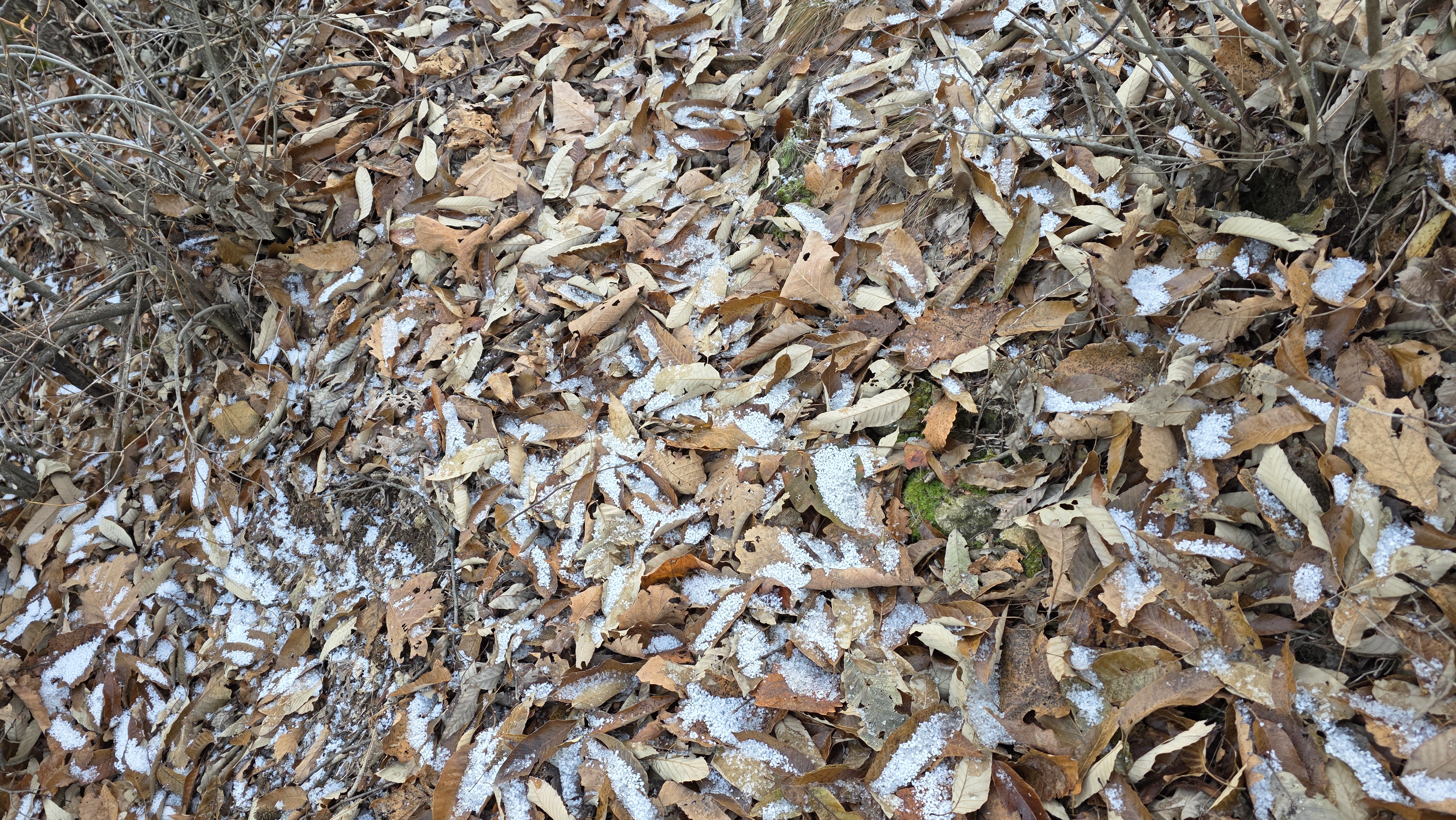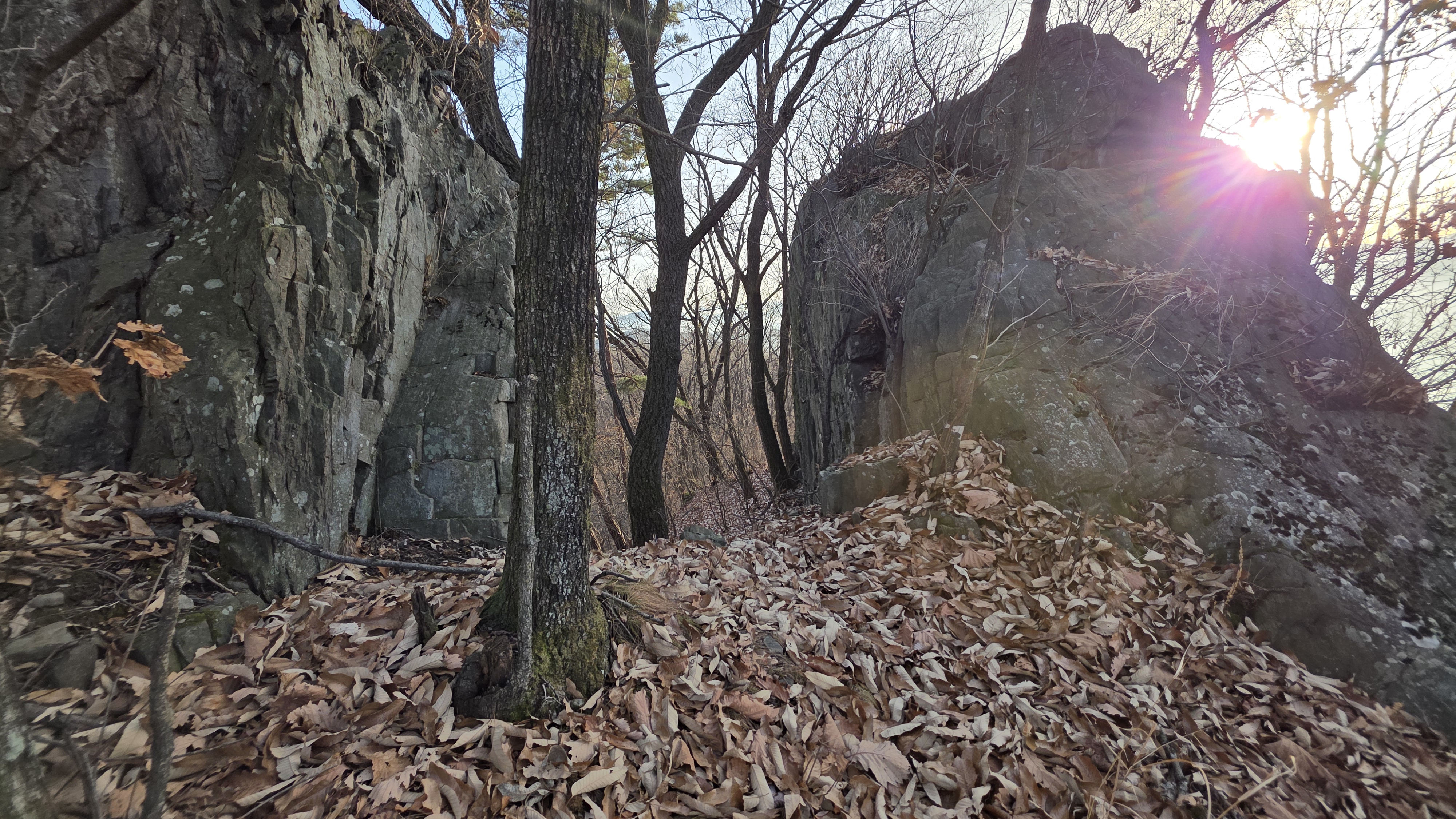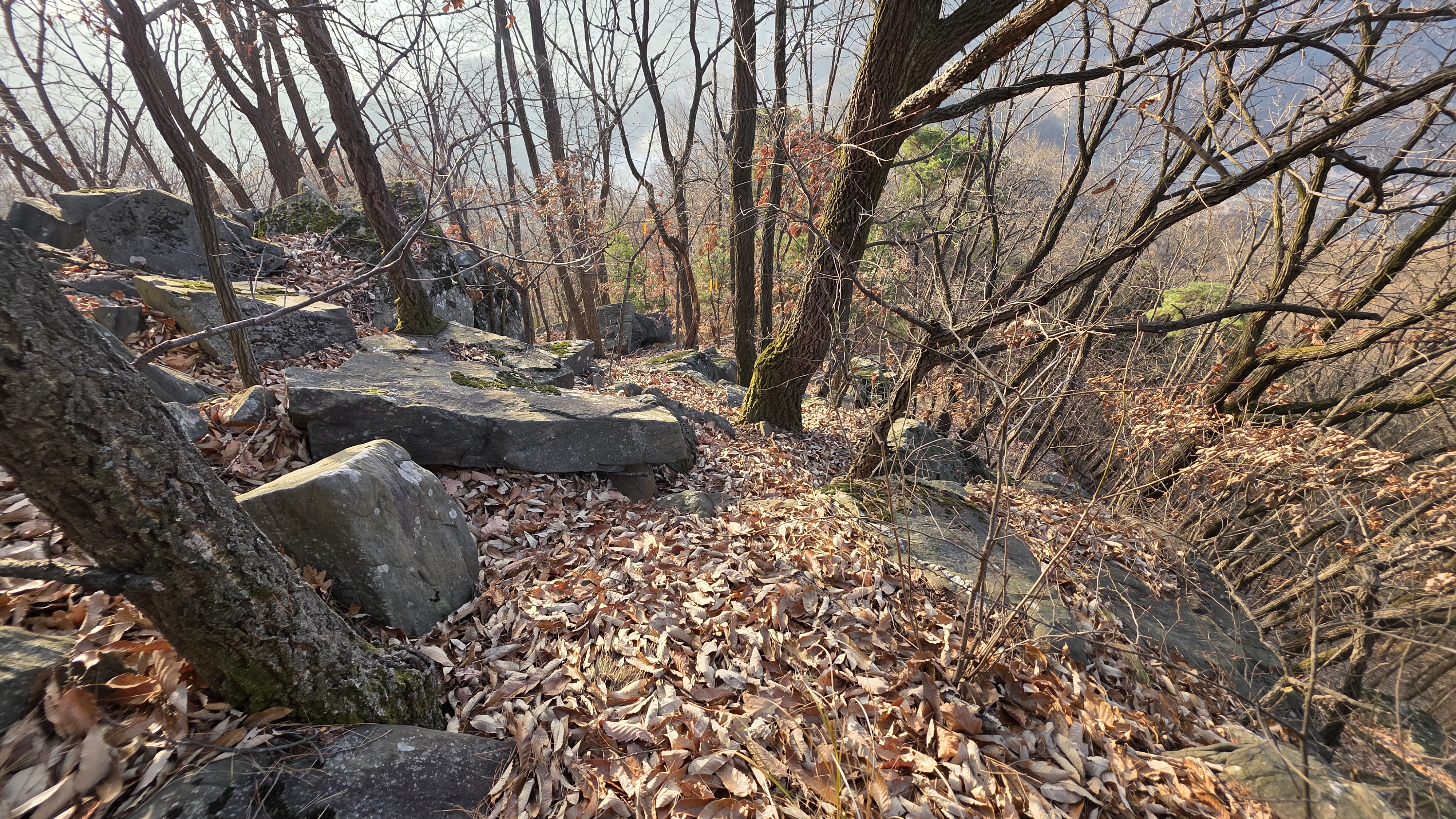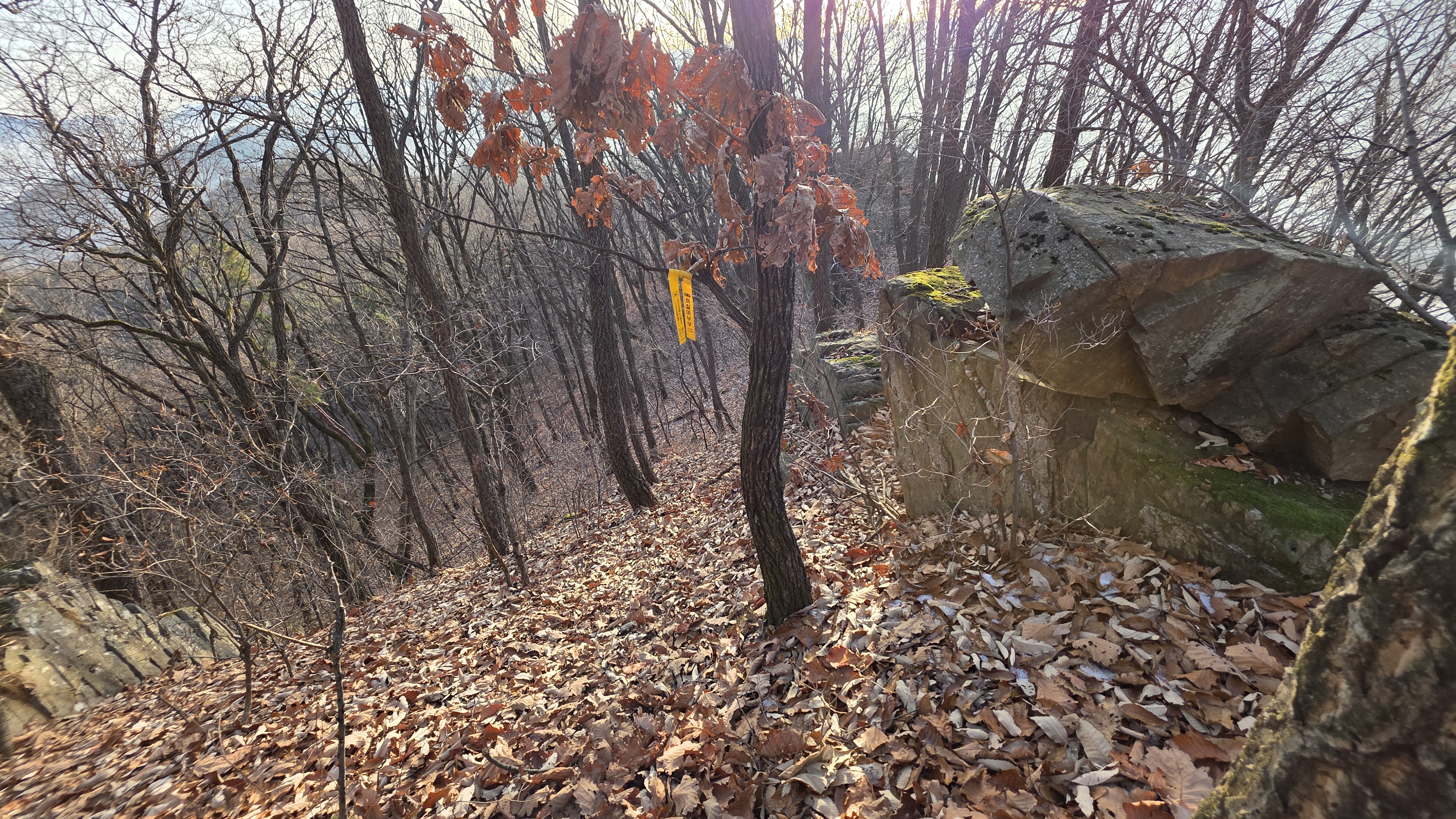 싸락눈 깔려있고 암릉길 우회하며 경사면에 낙엽 미끄럽습니다.