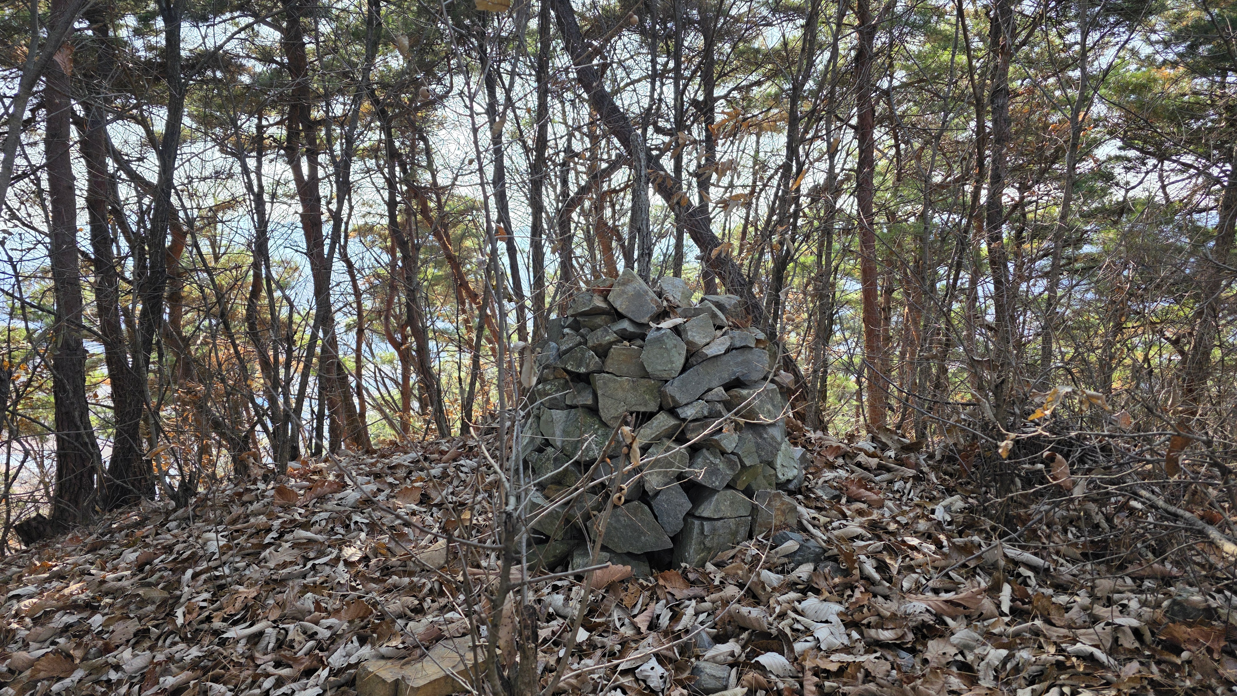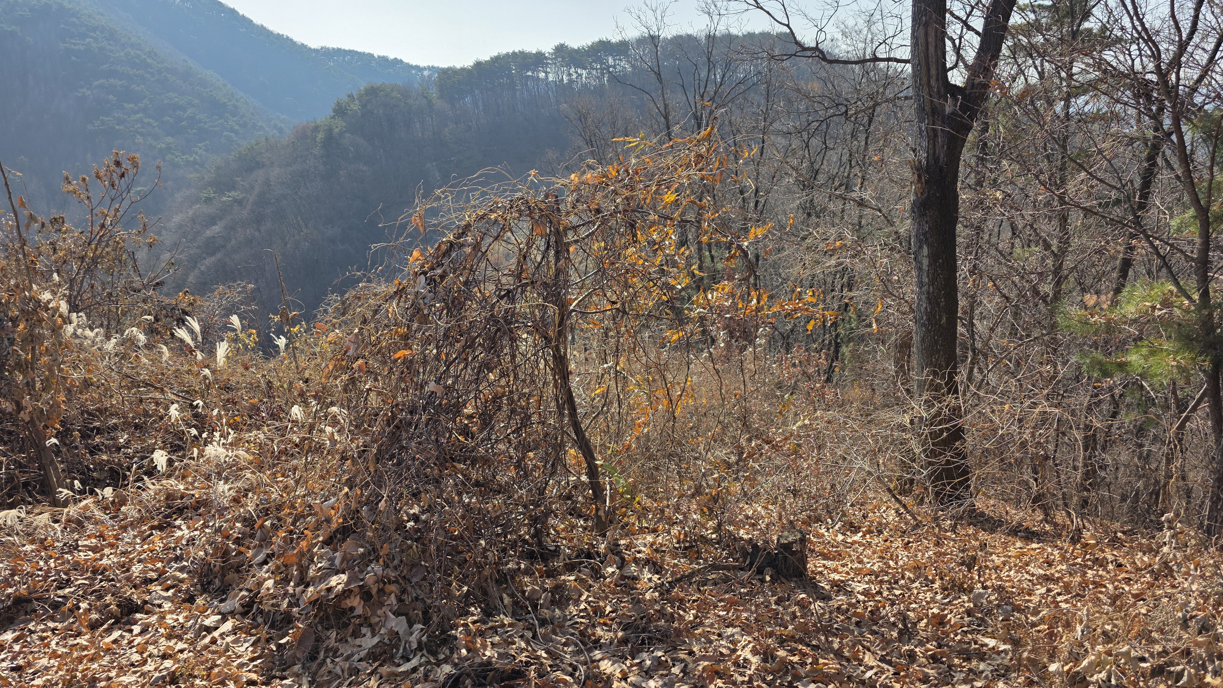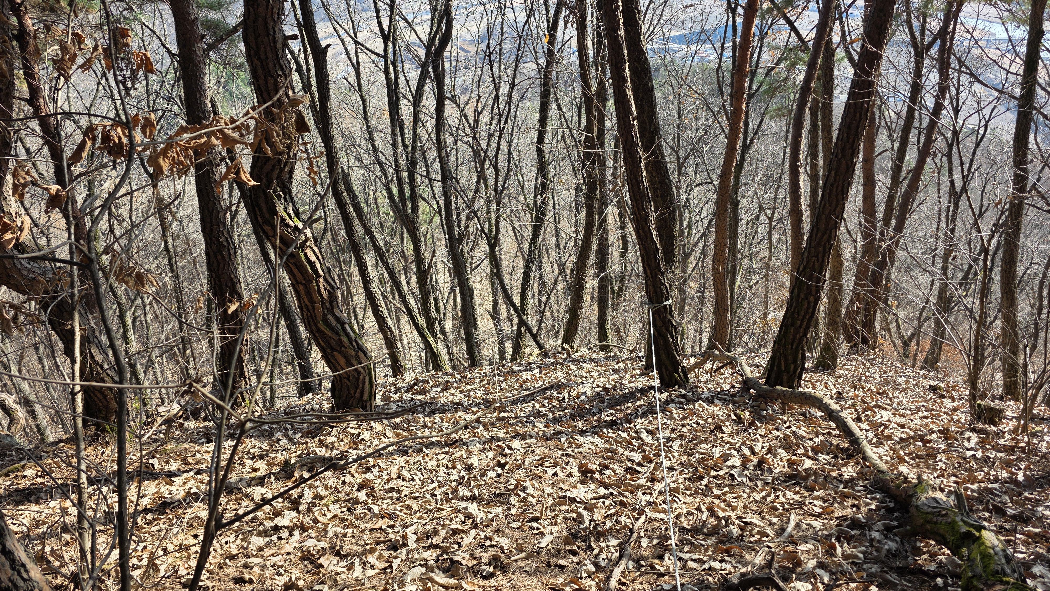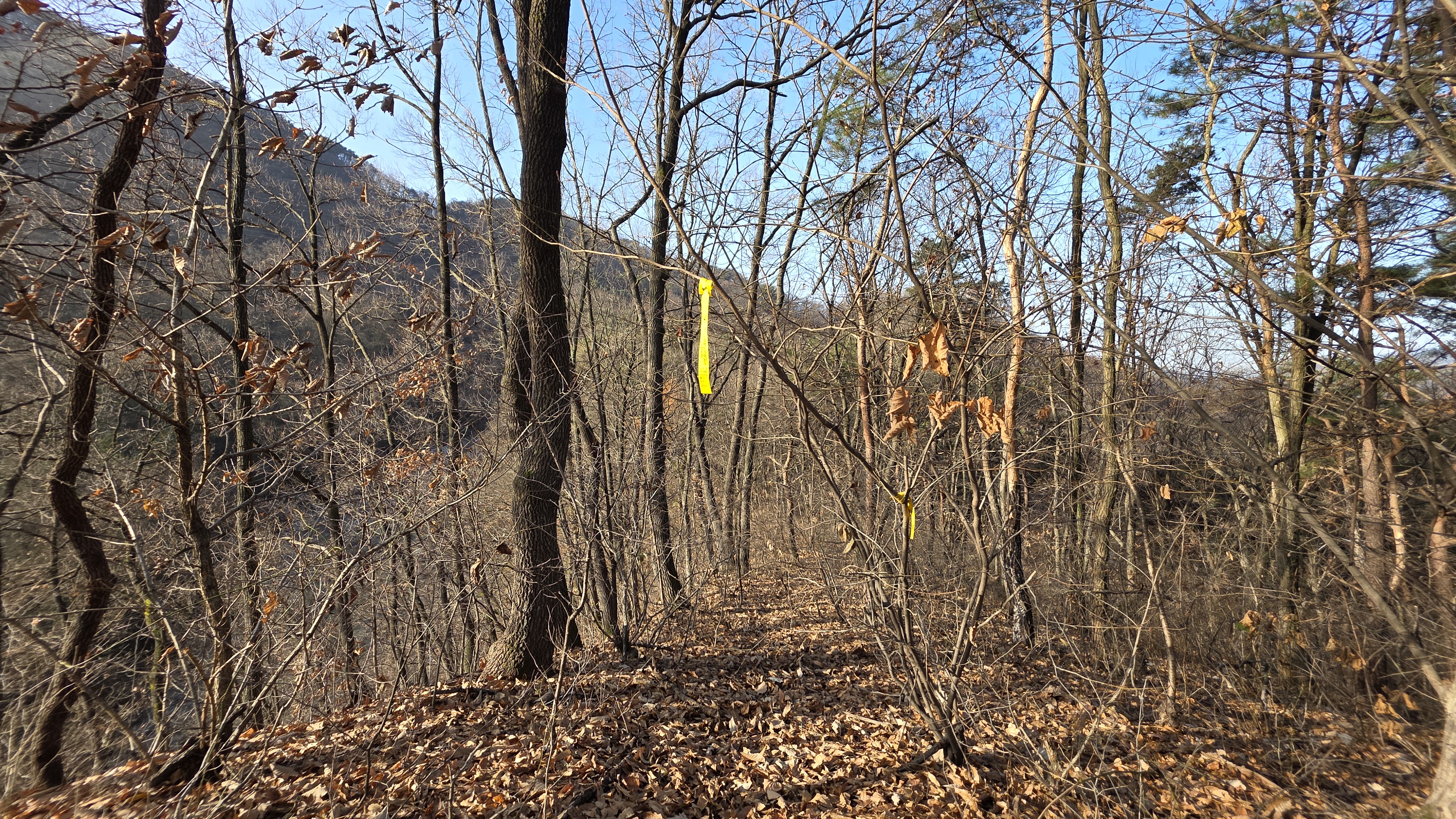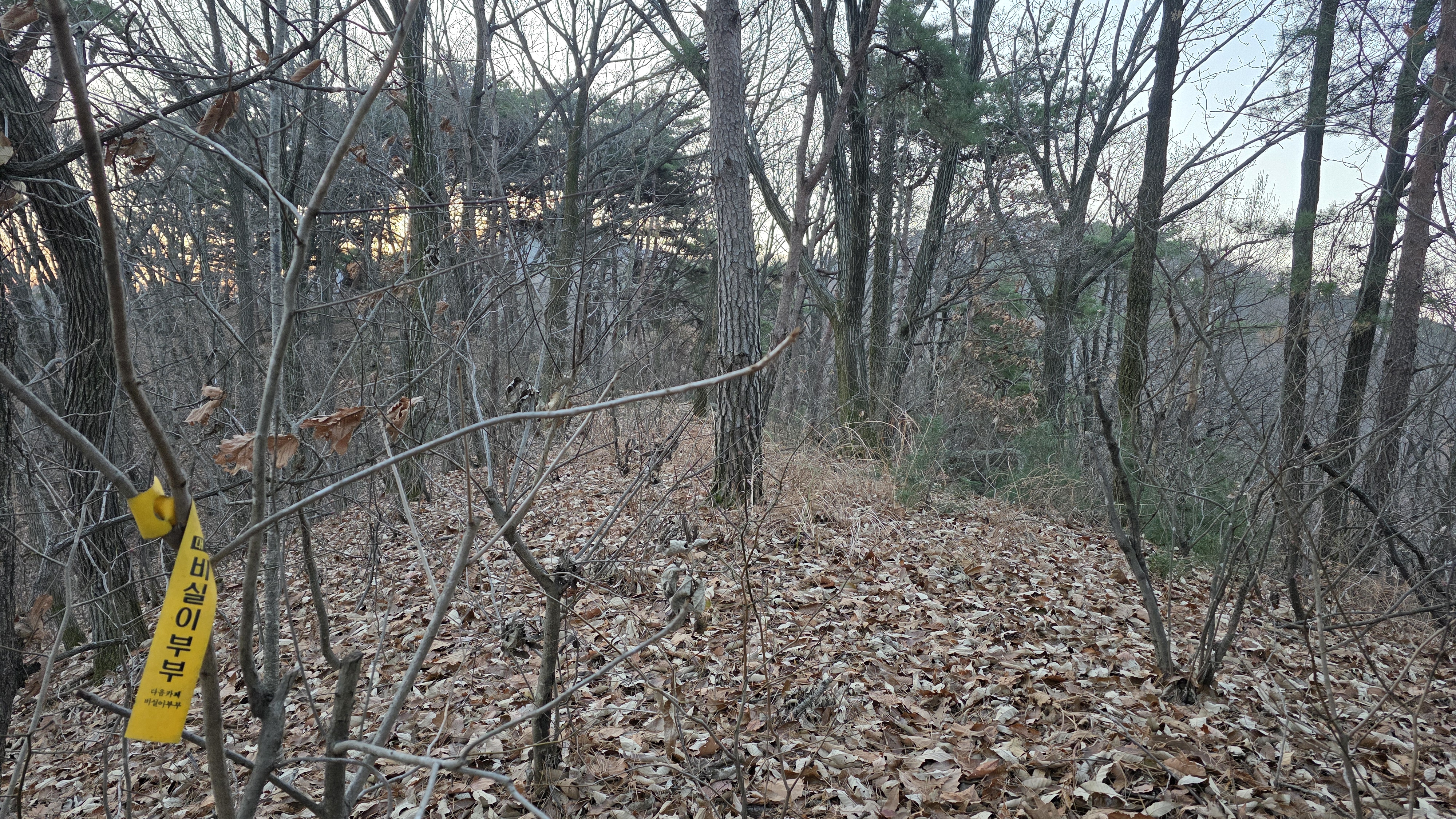 능선길 정상을 지나니 등로가 실종되었고 잡목길에서 잠깐 헤매다가 곧바로 내려섭니다.