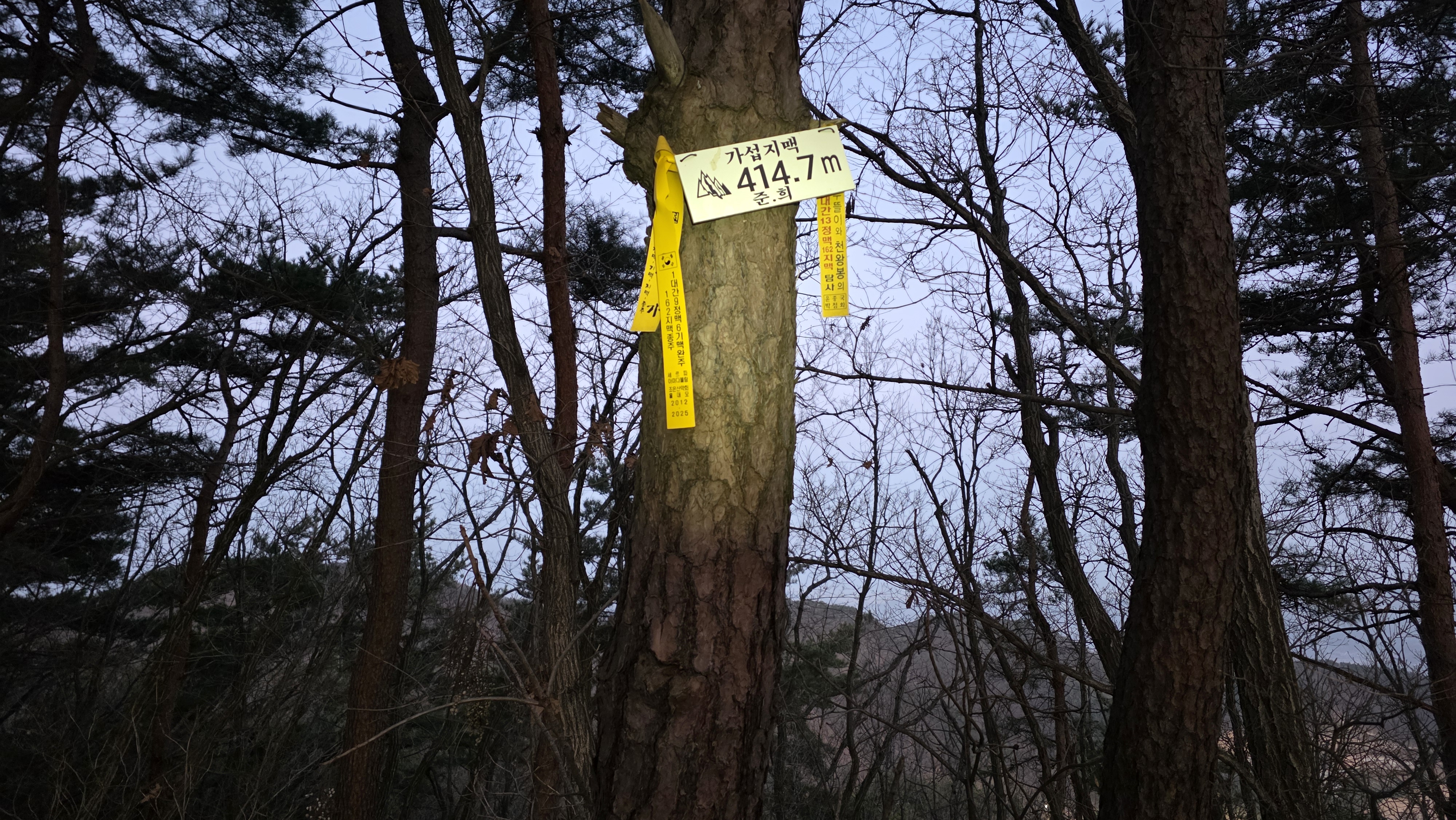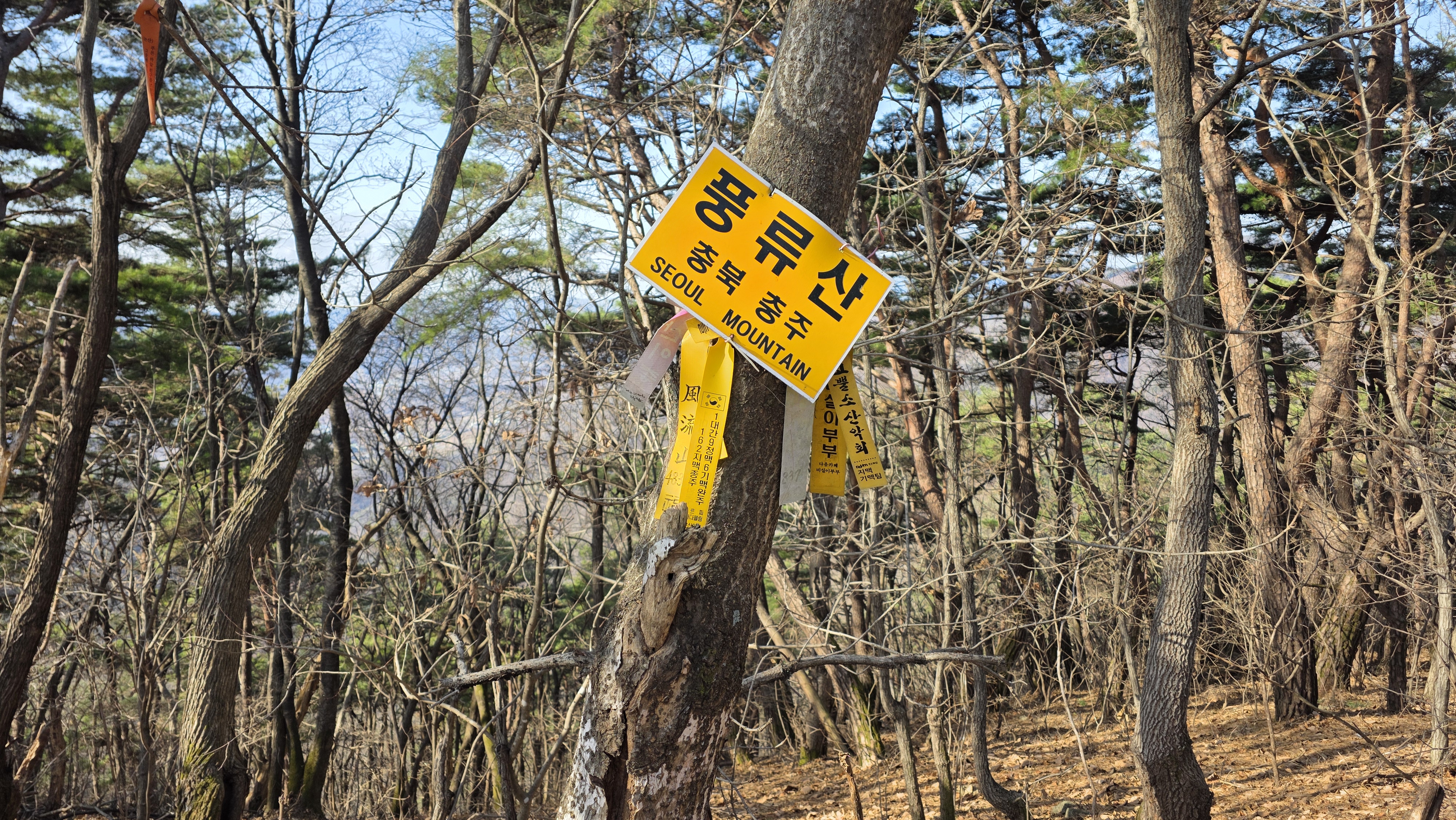 대간치에서 지도상 483.6 삼각점봉에 오르면 충주시에서 설치한 고도표시 없는 풍류산 산패~