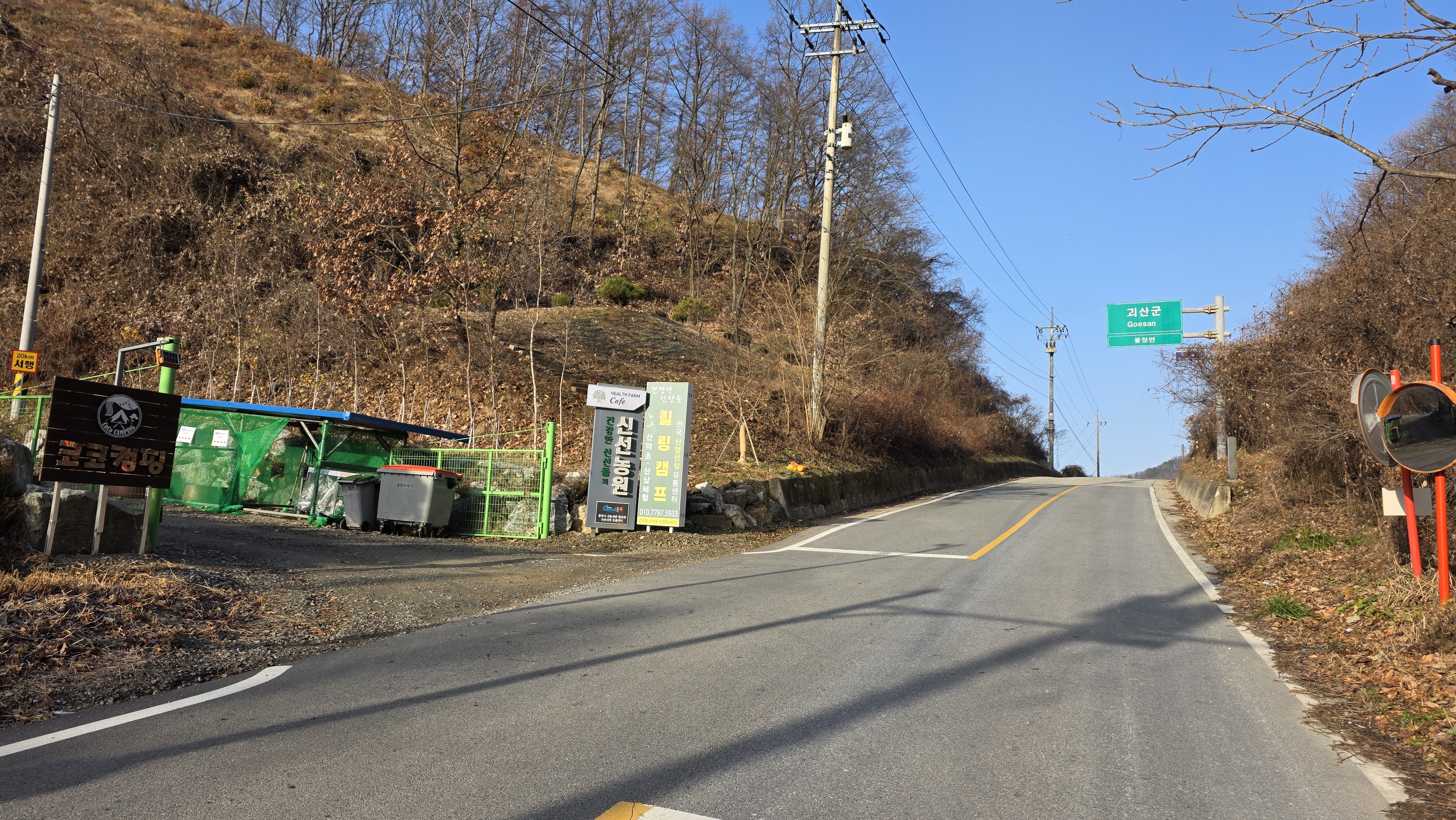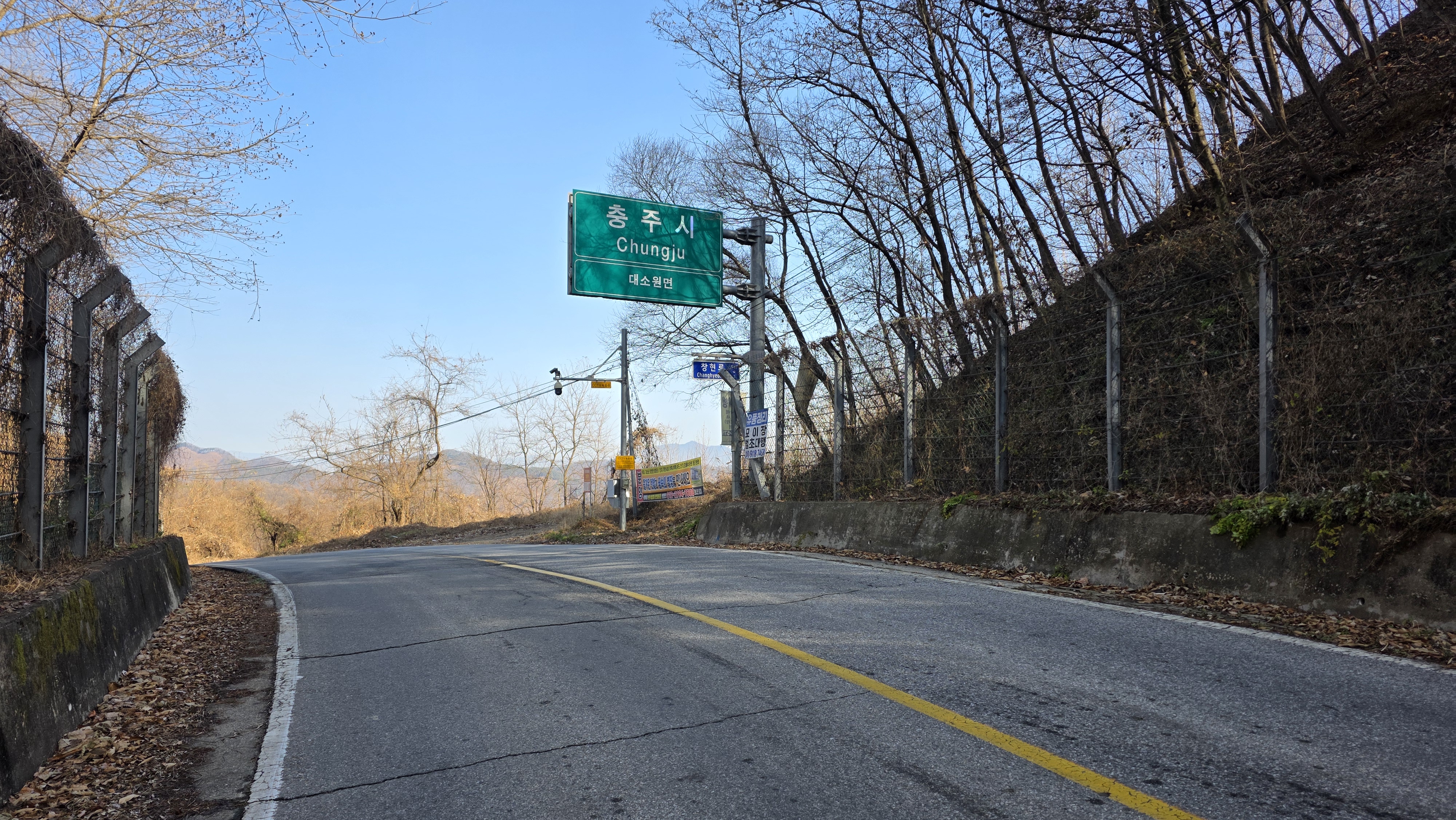 충주시 대소원면과 괴산군 불정면을 연결하는 고갯길, 철조망을 비켜 대소원면 간판 밑으로