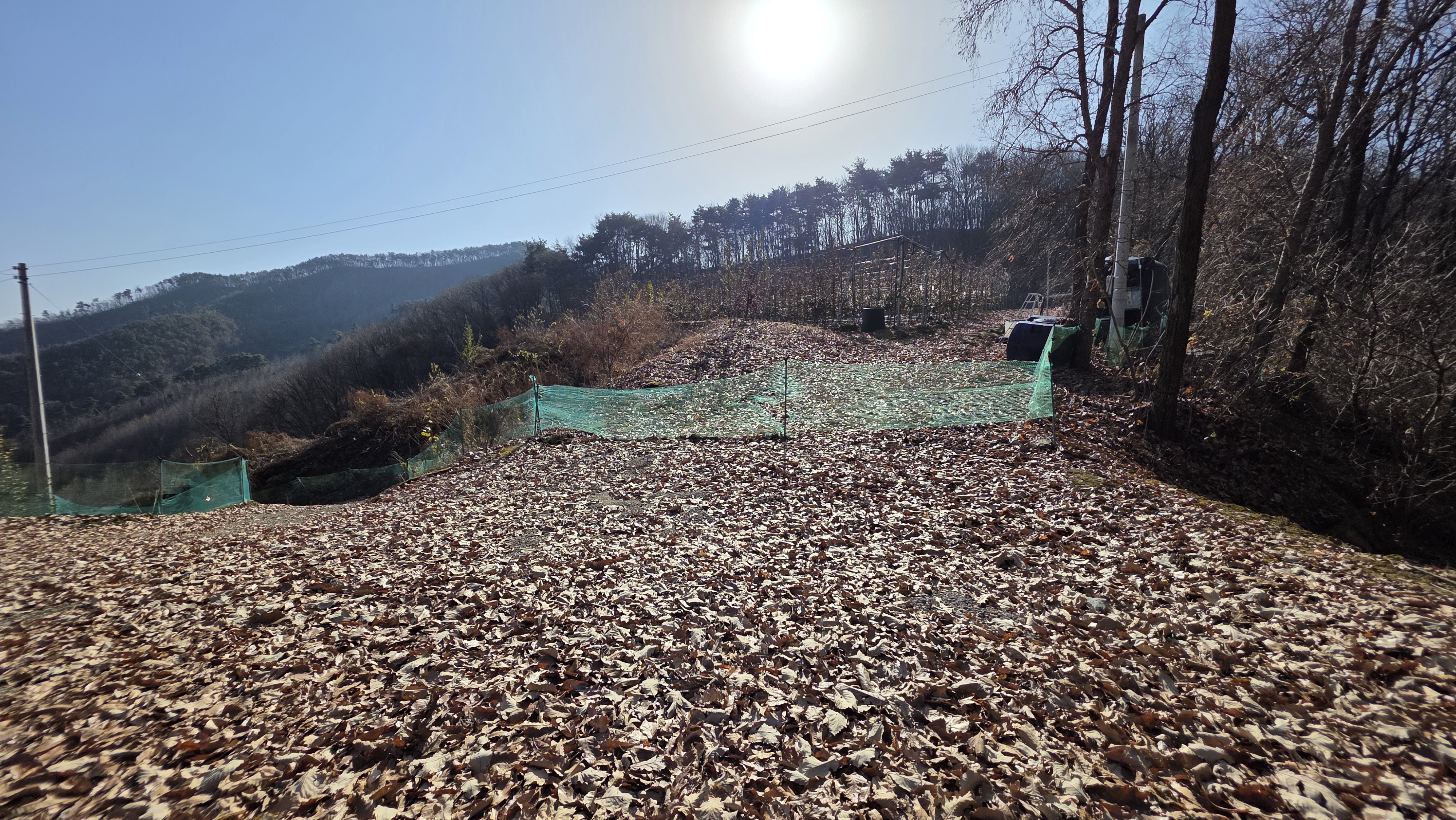 고개에 내려섰고 전방 그물망을 넘어 농장 안으로 진입 373.5봉을 올라야 되지만 농번기