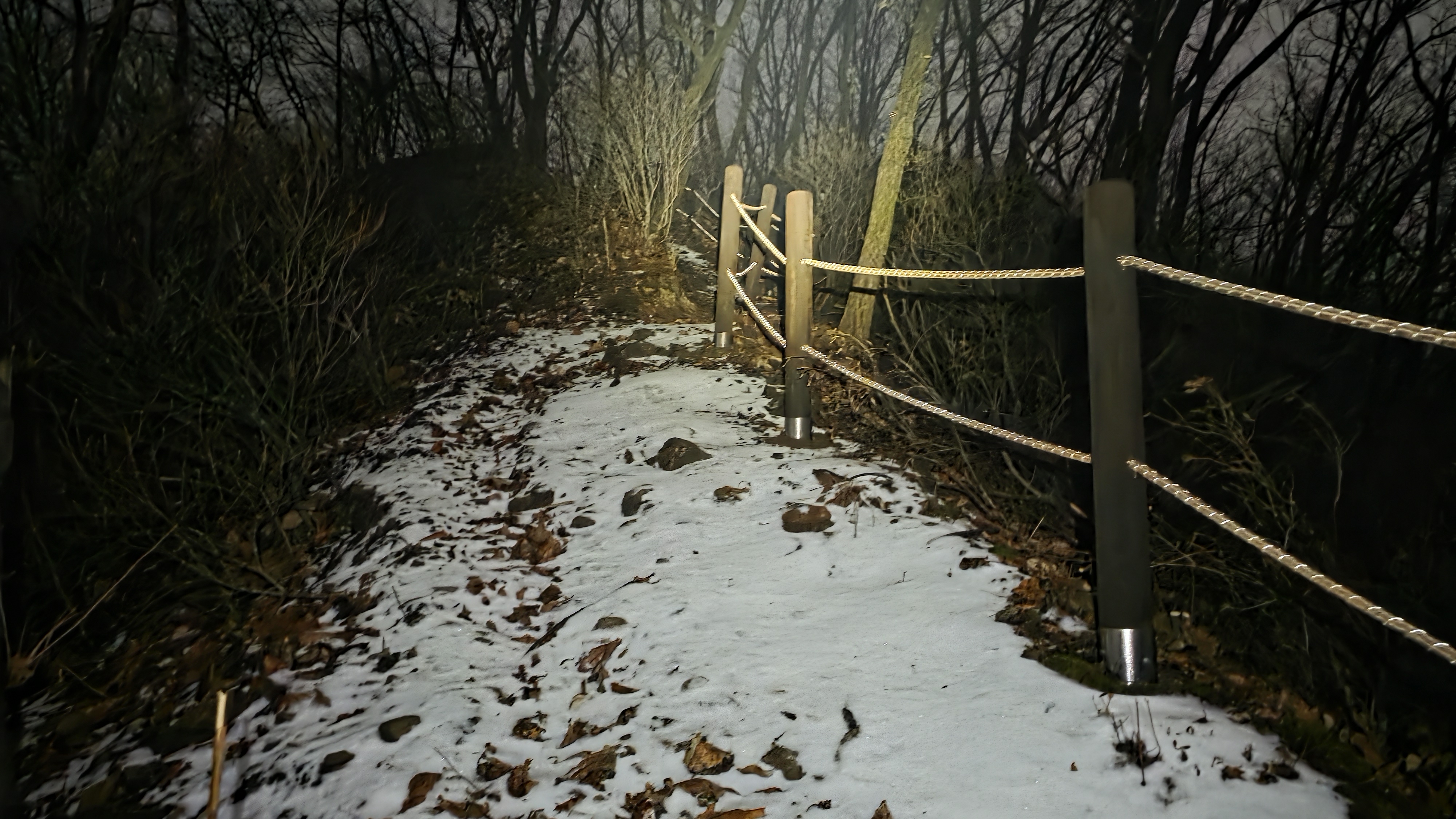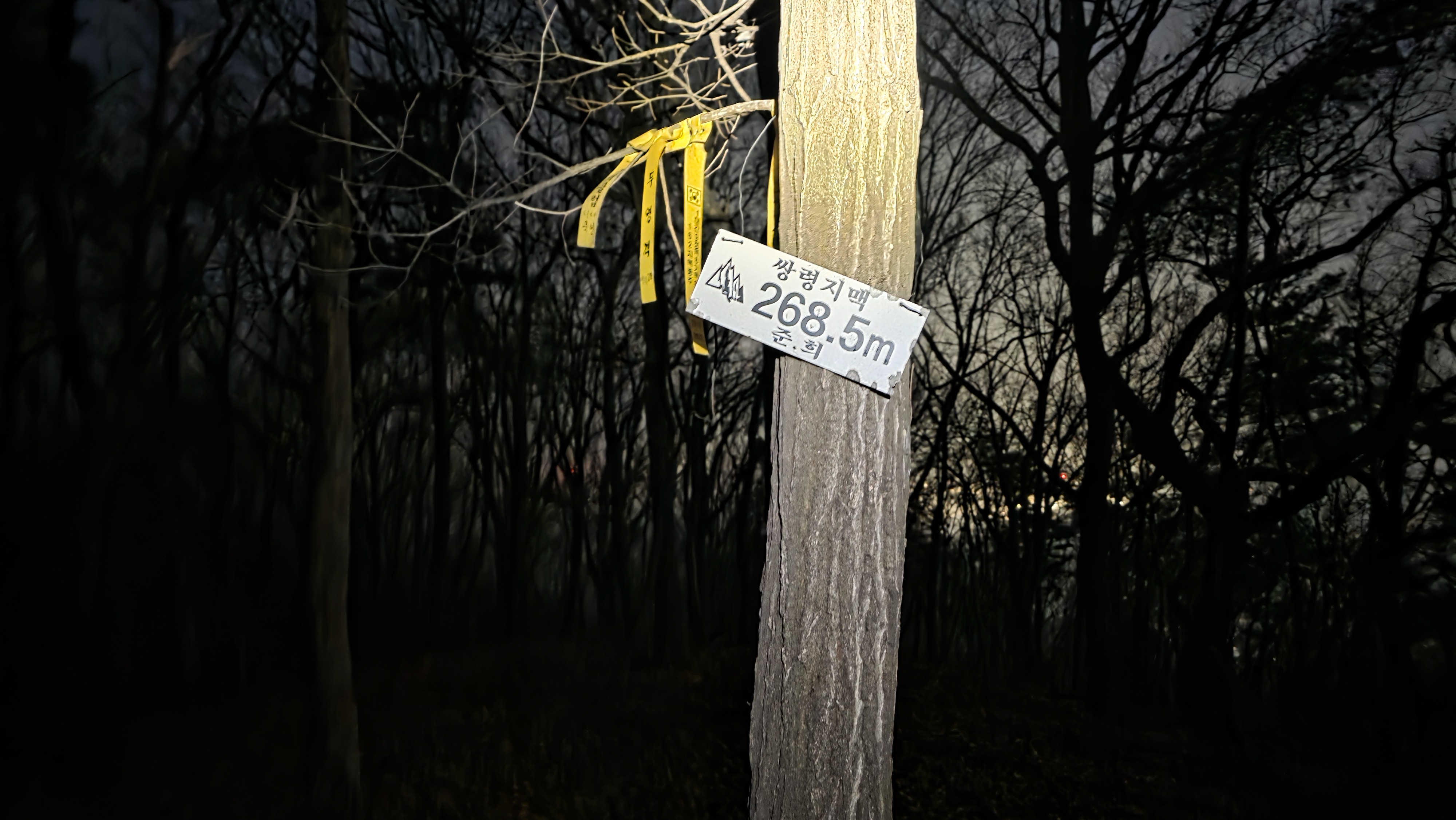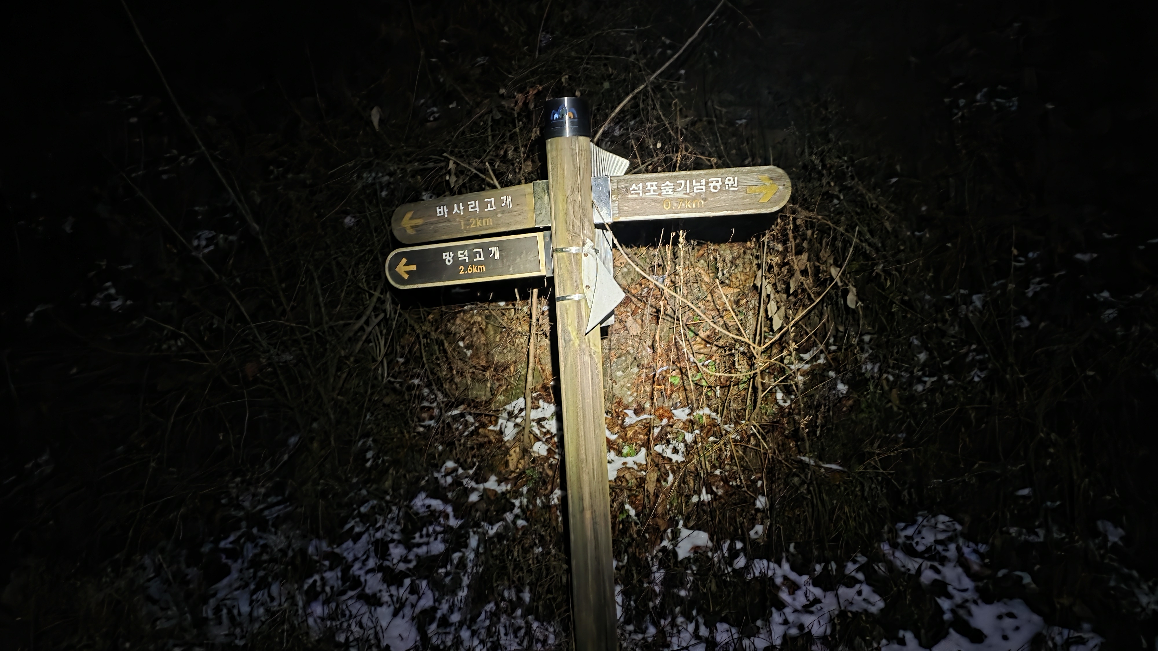 따르다 보니 좌방향 분기봉으로 오르는 마을길에는 눈이 녹지 않아 한밤중에 지난주처럼 차가
