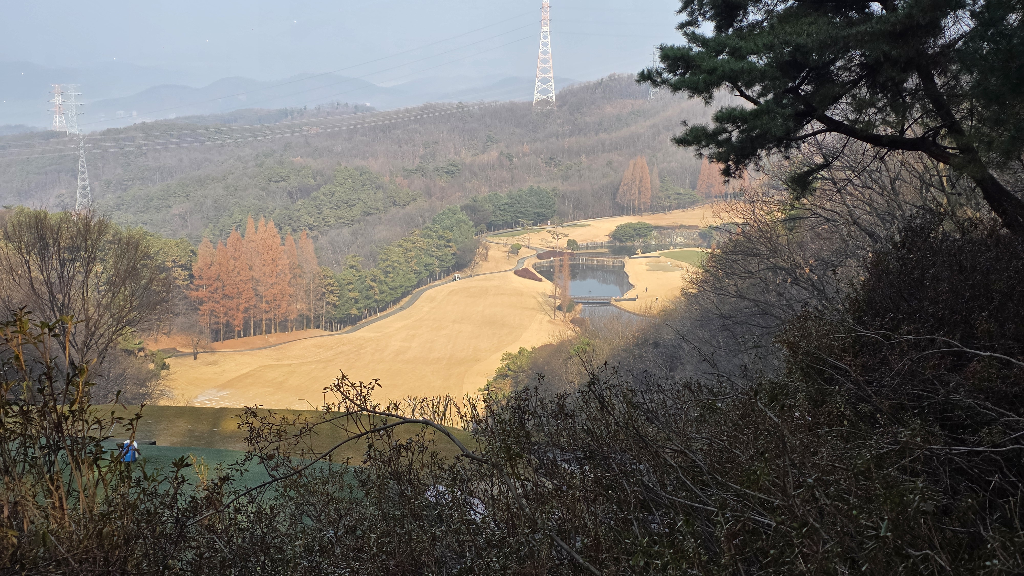 고개를 숙이는 능선 끝에는 마에스트로 CC의 윤곽이 서서히 드러납니다.