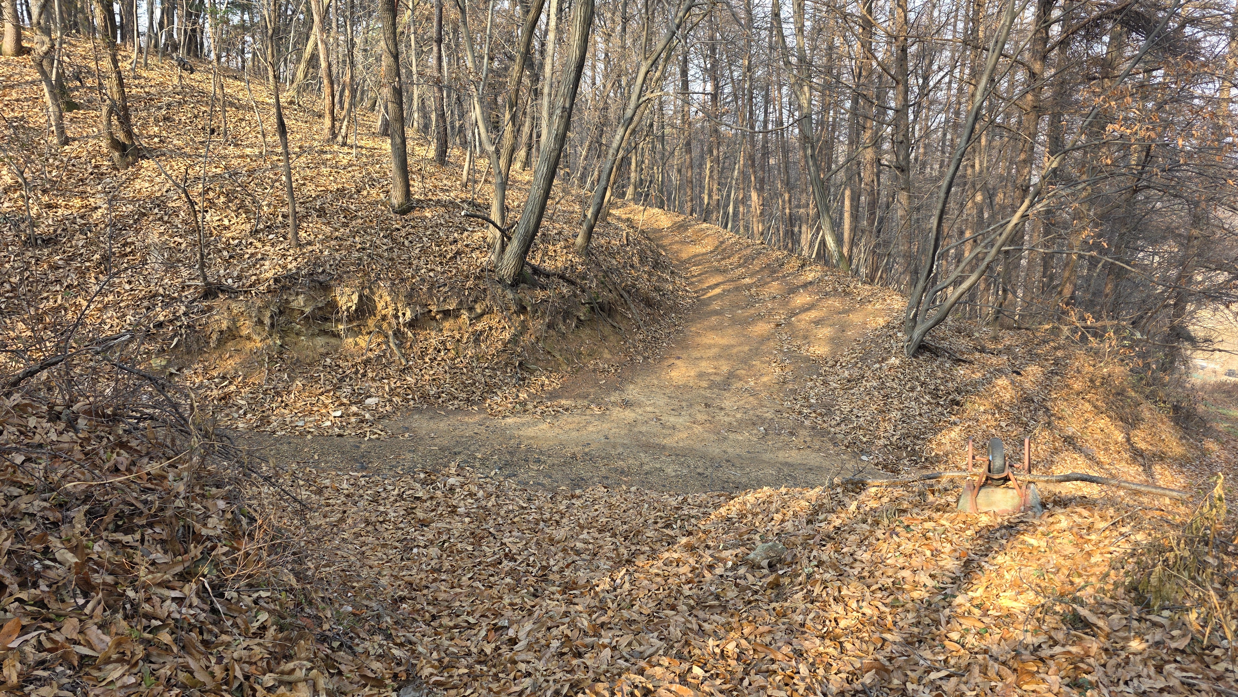 조금 전 내려섰던 카트길과 마주하던 무명봉으로 향 할 줄 알았던 등산로는 우방향으로 급격하게