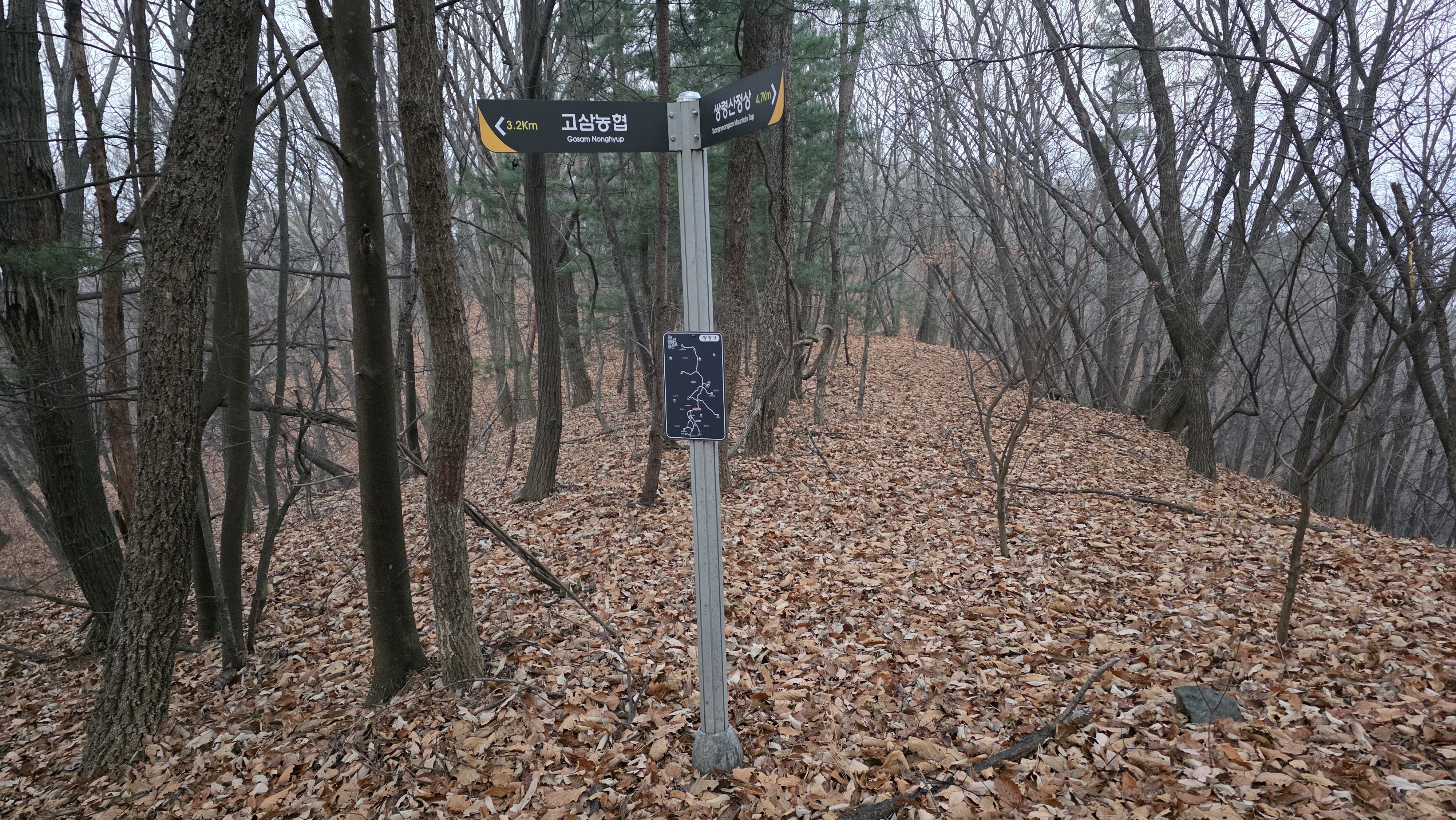쌍령산 정상에서 1km 지점에서 고삼농협 이정표가 나타났고 우 방향 계곡에는 포웰 CC안성의