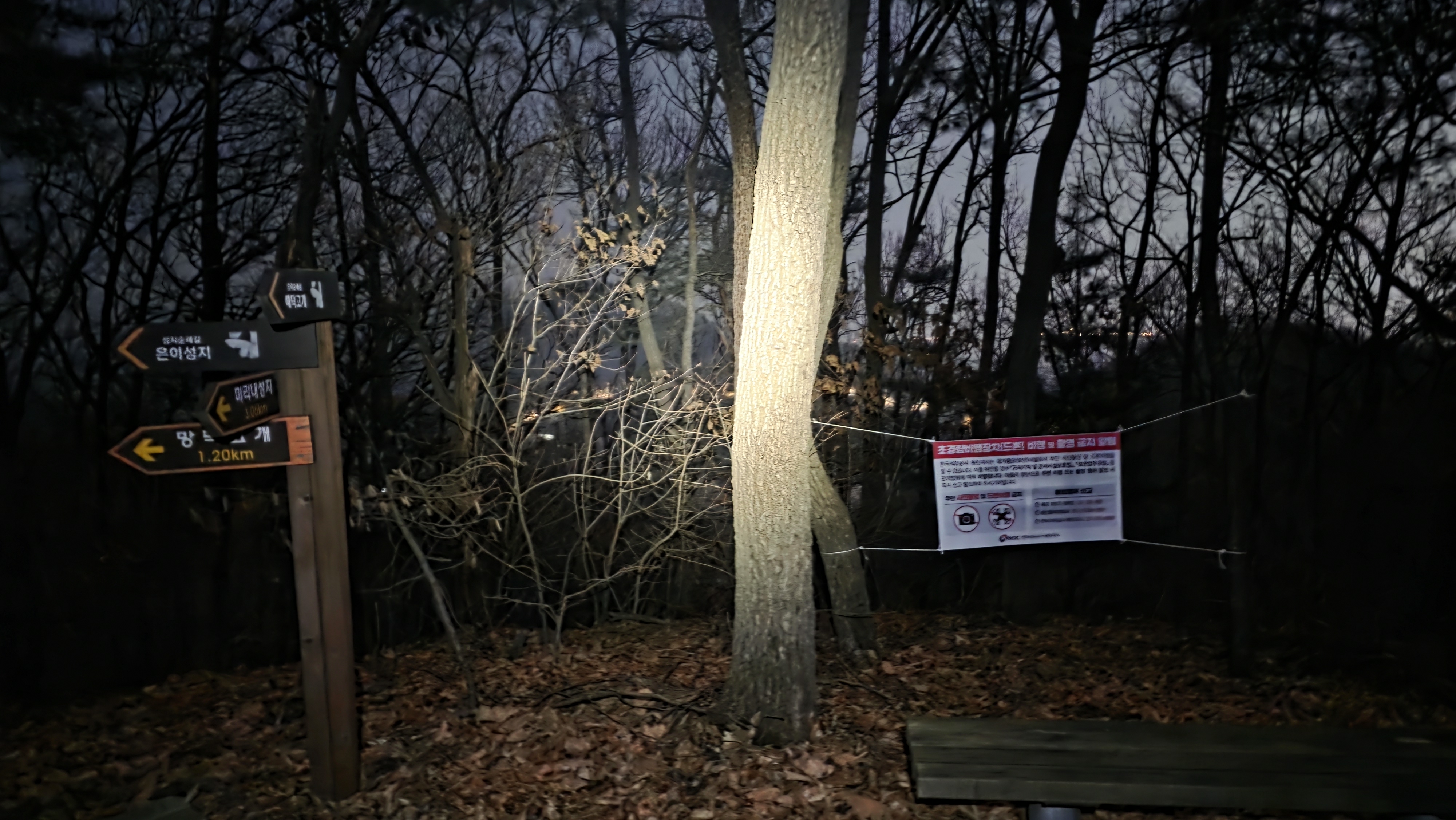 금병산 전 고갯길 산악오토바이와 바이크의 출입금지현수막과 이정표가 자리합니다. 06:53