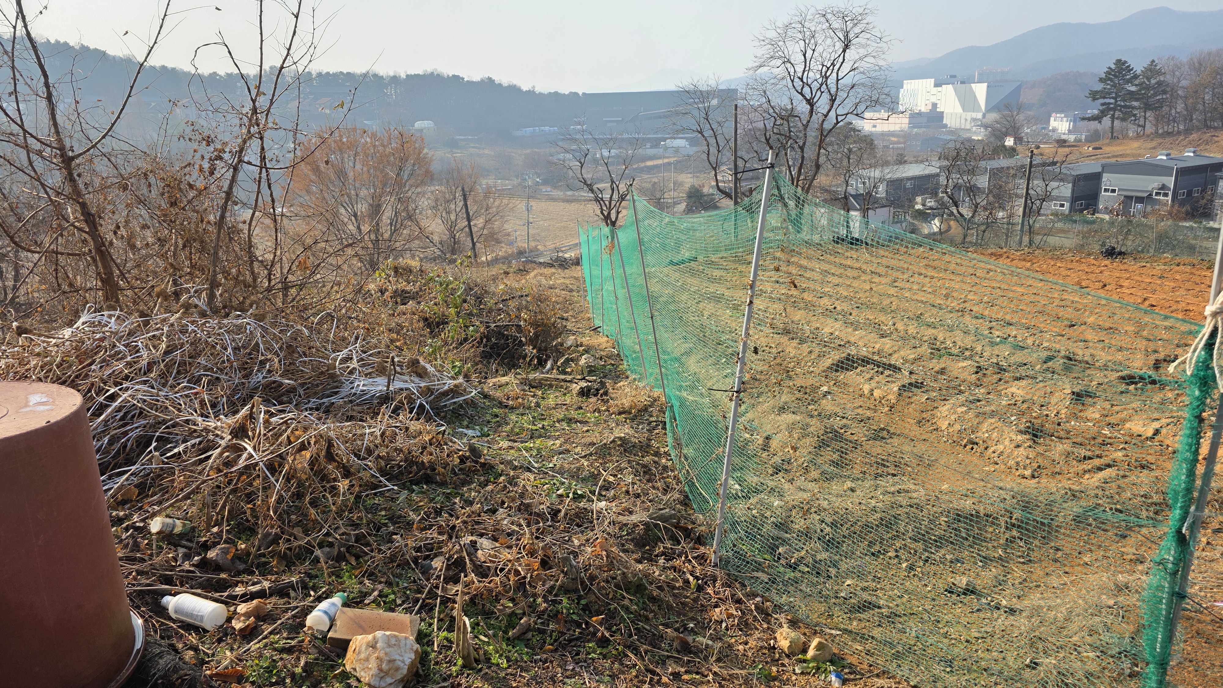 고개를 넘어서니 공장울타리와 골프장을 경계하는 울타리가 공존하면서 진로가 막혀 고민합니다.